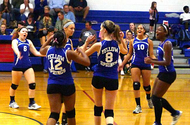 Kerns found other ways to help her players improve. She secured a $2,000 grant from YSI, Inc. for uniforms and to send her players to a summer camp. And she enlisted the assistance of Paco Labrador, the NCAA Division III girls’ volleyball Coach of the Year. Labrador, who led his Wittenberg Tigers to a NCAA championship last year, also happens to live in Yellow Springs, and was more than happy to help out his hometown team. Labrador taught special clinics, hosted the team at an annual high school camp at Wittenberg and ran a satellite camp just for YSHS players for the last two years.
