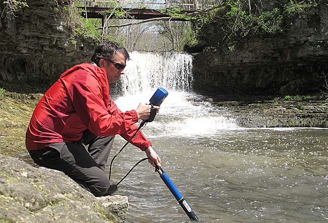 In its first year as a division of Xylem, YSI launched Exo, a new line of advanced water quality monitoring sonde systems. Here Rob Ellison, Director of Research and Development at YSI, tests an Exo sonde along Birch Creek in the Glen Helen Nature Preserve. YSI has continued double-digit growth since being acquired last year. (Submitted photo courtesy of Xylem)