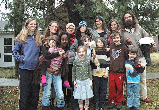 A small group of local residents will present a new winter solstice play “Return to the Garden: A Ceremony for the New Time” on Saturday, Dec. 22, at 7 p.m. in Westminster Hall at the Presbyterian Church. The players gathered in front of Rockford Chapel where they have been rehearsing, including, from right, back row: Caryn Diamond, Abby Cobb, Jenny Johnson, Saul Kola, Jennifer Johnson, Anna McClure, Rob Kola; front row: Camíla Dallas-González, Arielle Johnson, Eve Diamond, Phillip Diamond, Autumn Kola, Jacob McClure and Tomé Rios. (Photo by lauren Heaton)