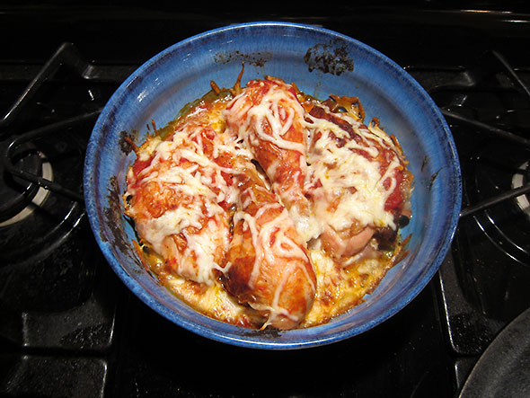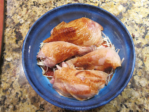 The secret for this Happy Children Chicken is minimal sauce—like the lesson I learned in making pizza recently. A mere tablespoon or two will suffice for the bottom layer of tomato sauce, and I brushed on tomato sauce on the chicken before layering with cheese. The bottom layer of shredded cheese becomes a treat in itself; it melts and crisps infused with both the mingling essence of the tomato sauce and chicken.