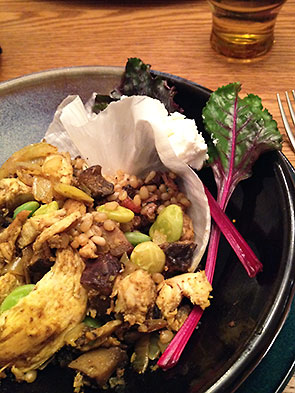 To dress our plates, I added a favorite salad from Current Cuisine—their wheat berry salad. Its raisin-dappled medley complimented the Indian-styled curry dish perfectly. I added a teaspoon of Blue Jacket Dairy’s Silver Lake Chèvre to counter to the dish’s warm tanginess.