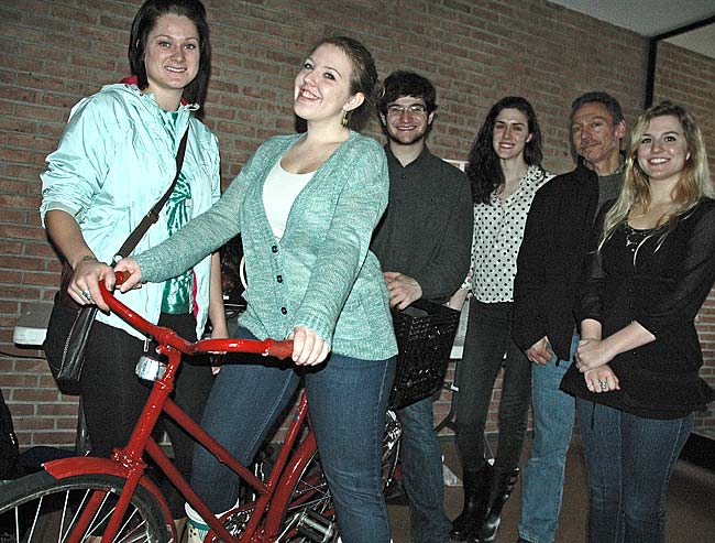 Students in Antioch College’s global health seminar presented their solutions to campus and community health problems at a public forum last month. One group started a college bicycle co-op and refurbished eight bikes to rent to students free-of-charge. From left are group members Jordan Berley, Emma Gilruth, Lucas Gottke and Katie Pitsenbarger, Antioch facilities manager Reggie Stratton and group member Elaine Bell. (Photo by Megan Bachman)