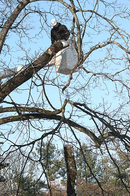Arbor Care crew member Aaron Horn was the lucky one in the bucket Monday morning on W. North College, as the company worked to cut down a diseased ash tree in front of a private home. Arbor Care owner Derek Willis says they took down about 30 ash trees in 2012 and are prepared for the much larger number to come down in the spring. (photo by Suzanne Szempruch)