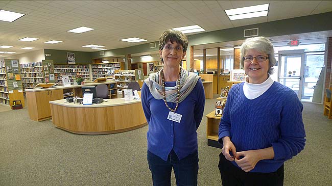 Librarians Ann Cooper, left, and Connie Collett helped design the new layout of the Yellow Springs Community Library, which recently underwent a major renovation. The more spacious lobby area seen behind them will promote better flow, while the new HVAC equipment, windows and doors may keep the 50-year-old building in good shape for another 50 years. (Photo by Megan Bachman)