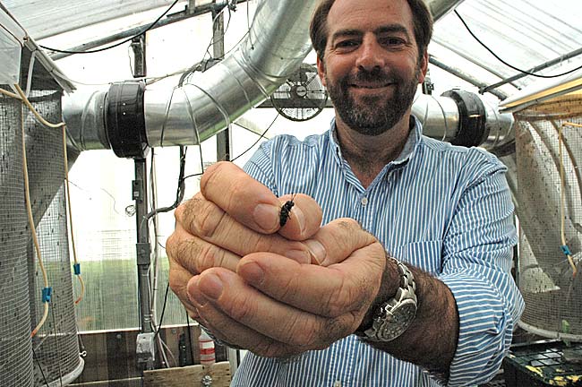 After several years of experimentation, Glen Courtright feels he has discovered a way to produce a high-protein animal feed that could revolutionize the world’s food system, using the larvae of the black soldier fly. Courtright is shown with one of the flies at his new business, Enviroflight, located at MillWorks. (News archive photo by Megan Bachman)