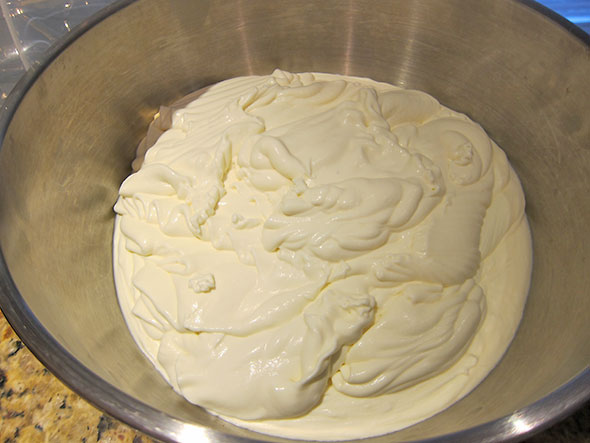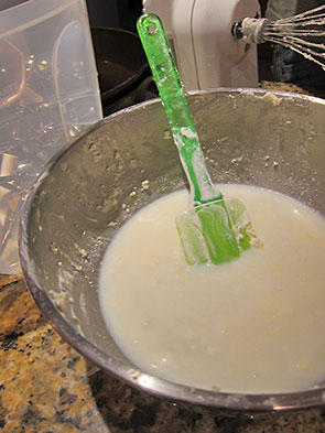 Jen used the mixer’s whisk attachment and after a mere minute began forming curds from the cream. It took another two minutes and then, again, the mixture suddenly collapsed into the butter and buttermilk. It’s interesting after several years of creating batters with a mixer to see how one can cause separation with essentially the same process.