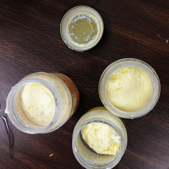 All the while, we continued to take turns with the 4-quart glass churn. We decided that, since the baby jars had the added advantage of gaining warmth from our hands, we should huddled around the glass jar to try and heat up its contents. We did this for the final 10 minutes of class; but, alas, we did not yet reach that golden moment where the butter and milk separate.