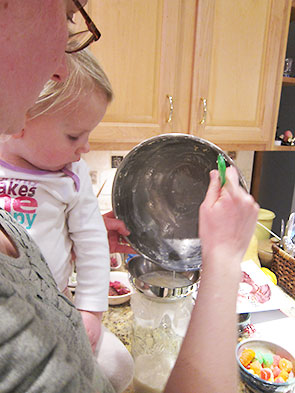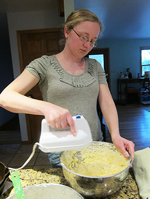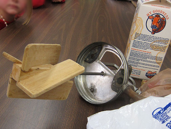 The children dispersed, and Jen and I collected our children and took the glass churn back to my house. After bouncing in Jen’s car, the mixture had thicken further. If only I lived farther away! Jen, not wanting to test the antique wooden paddle further, recommended that we break out the electric mixer. I poured the four quarts of whipped cream into two bowls, and Jen took the honors of beating out the butter using Grandma Rita’s electric mixer.