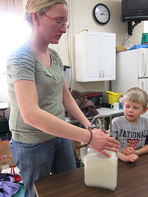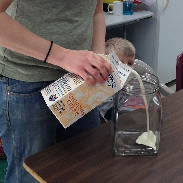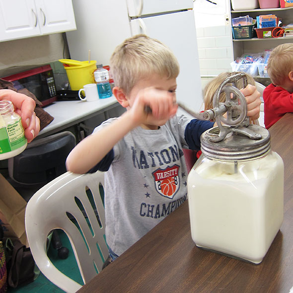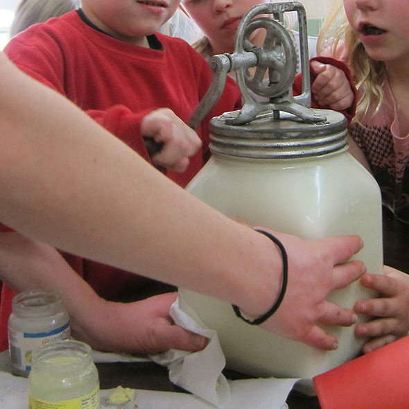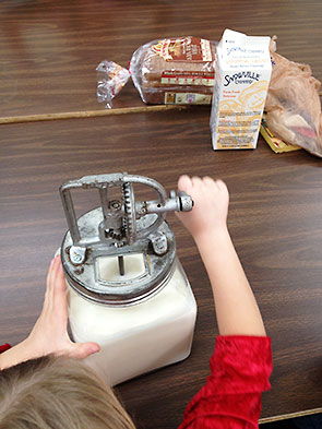 Jen had borrowed a 4-gallon glass churn from another friend of ours, Carol Cottom. The churn belonged to Carol’s grandmother. The children were counseled to be careful with the antique glass and wooden paddle, and they proved responsible and attentive in their care. On Carol’s advice, Jen poured in 3 gallons of thick whipping cream, screwed on the lid, and passed it around the table for each child to take it for a spin. We all had to chip in as the process would take about the whole class period…we hoped.
