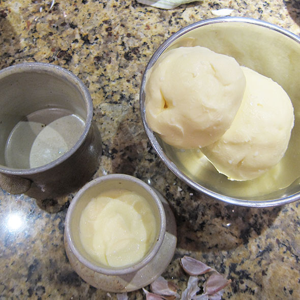 Jen molded the butter into balls and I weighed our results. One gallon of whipping cream made over three pounds of butter and two quarts of buttermilk. My daughter’s share of this bounty was about a quarter pound of butter, and we molded her portion into a french butter dish from Miami Valley Pottery.