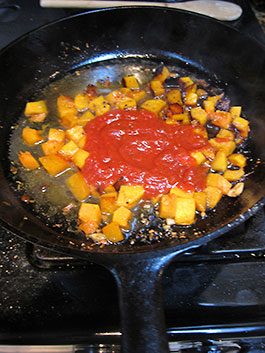 The squash we cut open gave us a pleasant surprise with its bright orange flesh. I choose walnut oil for the pan fry and started the squash cubes in a hot skillet set to medium flame. I added a pinch of powdered garlic and skipped the jalapeño and onions all together acknowledging that the children would indeed appreciate a simpler dish.