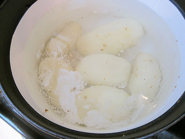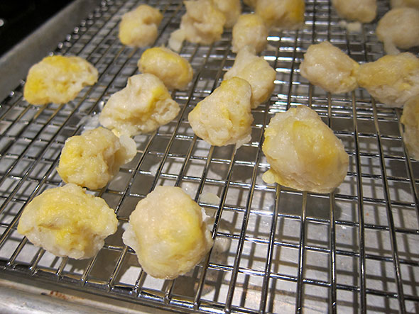 The potatoes came out to cool for handling, and soon we started the ricing. A couple of years ago, I had found an old ricer at a local antique shop. It did ok service, but a pound of tubers is a lot to go through and I hadn’t boiled them quite soft enough. We tried grating the potato with a zester and were happier with the results, but it proved a timely process either way. Having no place to go, we stuck to it.