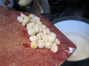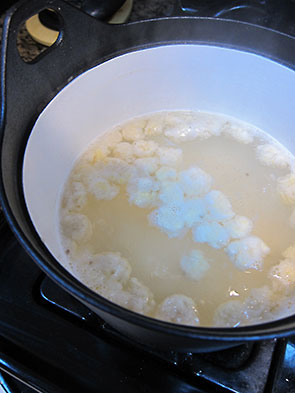 Forming gnocchi is a family process. I’d say four people is about perfect. Two to rice the potatoes, two to roll the dough and cut the cubes. The latter job is the perfect for a five year old. As soon as we had our first batch of gnocchi dumplings ready to boil, I reused the water we used to boil the potatoes thinking it might make them tastier. We followed Mr Batali lead ducking them in the water, giving them a stir, and then forgetting about them as we turned to the pan fry.
