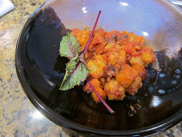 Along with the pound of potatoes, I used one squash and about one cup of sauce. Then I made the dish in three batches so not to not crowd the vegetables in the pan. The dish was really marvelous. We made enough for four servings. We ate some immediately and some later in the day. The excellent flavors improved further with the extra time for mingling.