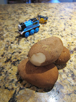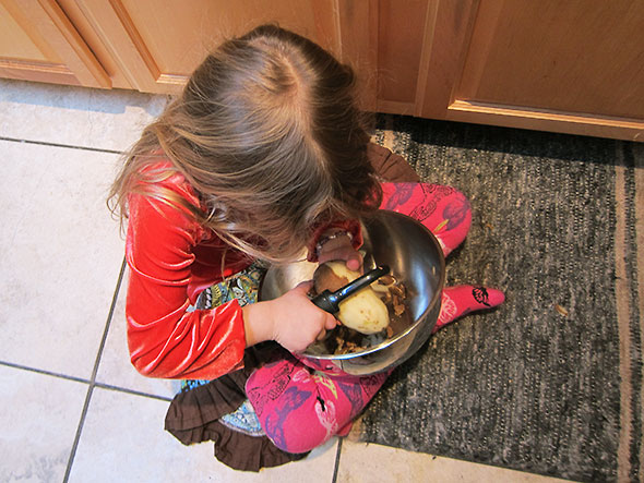 Unmistakably inspired, my daughter and I set about peeling our potatoes. This occasion marked the first time I entrusted her with a kitchen sharp—the time-honored kitchen patrol standard potato peeler. I gave her the biggest potato, and she determinedly set about shaving its skin while I tackled the others. She did a fine job in this new skill and soon we set our naked potatoes in a pot to boil. I set about skinning the squash while my daughter spread out its seeds to dry for planting in March. She restarted the New York Times video and vetoed the hot jalapeno pepper, a decision I could easily respect.