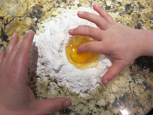 We watched the video a couple of times through to appreciate Mr Batali’s strategy. He managed two pots like child’s play but I had heard enough about gnocchi to know this was no small undertaking. Mr Batali put a pound of well boiled, starchy potatoes—still warm from boiling—through a ricer. He formed the riced potato in a volcano-like well, coated it with about 100 grams of flour, and cracked an egg into the center. With practiced wisdom of his grandmother to know what was “just enough”, he formed a light pasta dough for the gnocchi.