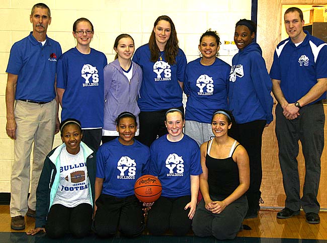 Over the weekend the YSHS girls basketball team won the Division IV sectional tournament title for the first time since 1987. They defeated Cincinnati Seven Hills 44–24 at Monroe High School. The team includes, from left, back row: Coach Tim Barga, Molly Hendrickson, Anna Mullin, Paloma Wiggins, Rachele Orme, Angela Allen, Assistant Coach Jack Hatert; front row: Brianna Ayers, Kennedy Harshaw, Keturah Fulton and Maryah Martin. (Submitted photo by Vince Peters)