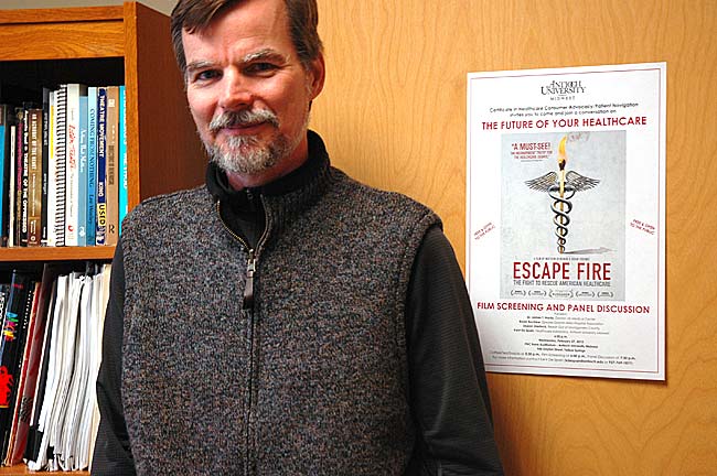 Antioch University Midwest is sponsoring a free documentary, ‘Escape Fire: The Fight to Rescue American Healthcare,’ at the school on Wednesday, Feb. 27 at 6 p.m., with refreshments at 5:30 p.m. Shown above is Kent De Spain, the new chair of the school’s program for healthcare consumer advocacy/patient navigation. (Photo by Diane Chiddister)