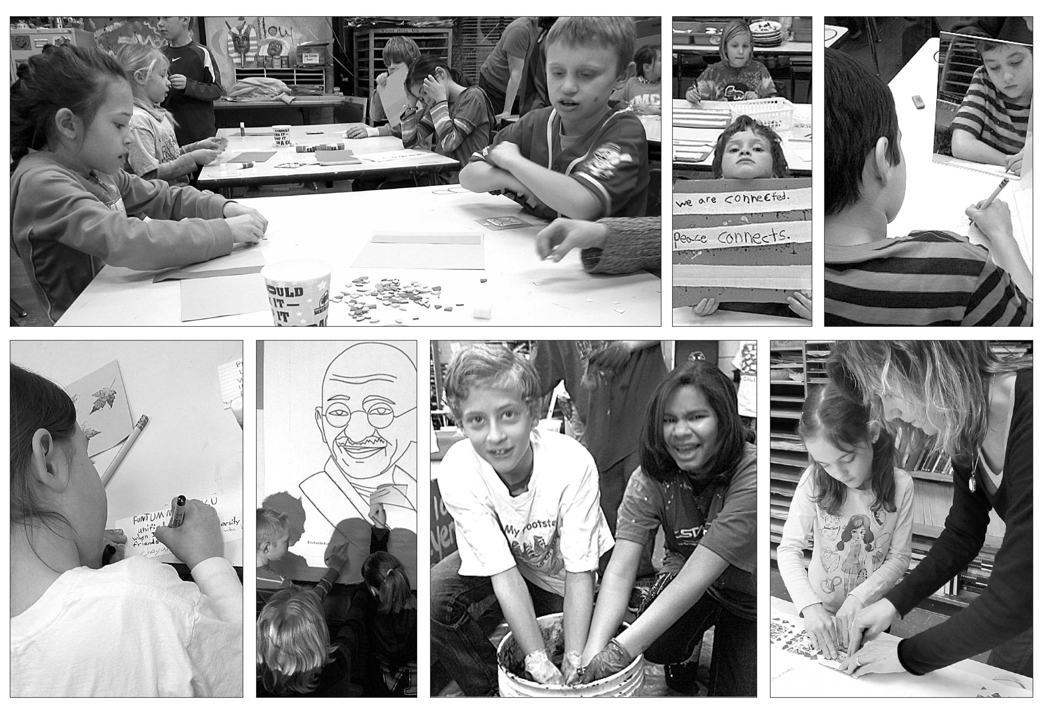 For the past eight weeks, Mills Lawn students have been involved in a whole-school project that promotes building a culture of peace. The culmination of Project Peace, a multimedia triptych featuring portraits of historic peacemakers, will be honored at a reception from 2–4 p.m. on Sunday, March 24, at Antioch University Midwest. Shown above are, from top left clockwise, second graders Karmyni Van Pelt and Joshua Clark; kindergartner Sam Trelawny-Cassity holding a peace message; Kaden Bryan drawing his self-portrait; artist-in-residence Deb Housh working with Olive Cooper; sixth-graders Teymour Fultz and Hailey Qualls immersing themselves in indigo dye; fourth graders admiring a portrait of Gandhi; and a student writing her peace message. (photos by Allison Paul)