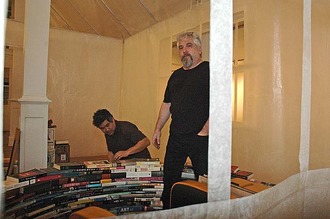 For his part in Appetite, Miyazaki focuses on his own unbridled consumption of knowledge and books. The wall of books within which he will be nearly imprisoned for periods throughout the duration of the two-month exhibition is a symbol of the tension between “the immense pleasure” he gets from reading and the consumption aspect of his book collecting. Miyazaki has also observed that since quitting his job as a professor of political science at Wittenberg in order to run a cafe (which he fell in love with largely because it’s a good place to read), the ultimate injustice is that he can never find time to sit down and enjoy it. Now he plans to feed his desire to read as part of the exhibit.