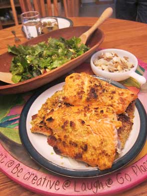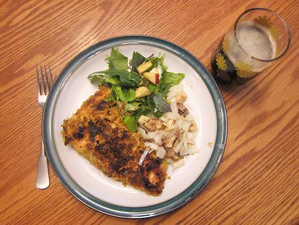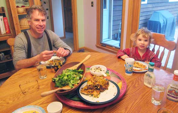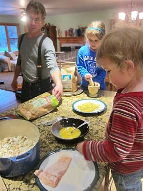 After spending the day by myself in a too quiet house, I was grateful when the family came home for the evening. Fish was on the menu for dinner and we set up shoulder to shoulder in an assembly line to prepare our filleted trout. My son manned the flour, I was posted at the egg wash, and my daugher stationed herself to make crumbs from guacomole-flavored corn tortilla chips. My husband took the responsibility over the surplus chips and setting the table.