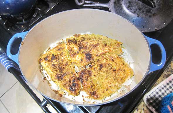 First, we dredged the fish filet in a mixture of flour, salt, and pepper until the filet was powdered white. Next, it got a quick bath in a wash of beaten egg and plopped onto a plate covered in the crumbled chips. We laid the fish over top of a chopped half onion and several diced mushrooms dotted with pads of butter in a dutch oven. These we broiled for 8-10 minutes until top of the trout was crispy and just blackening.