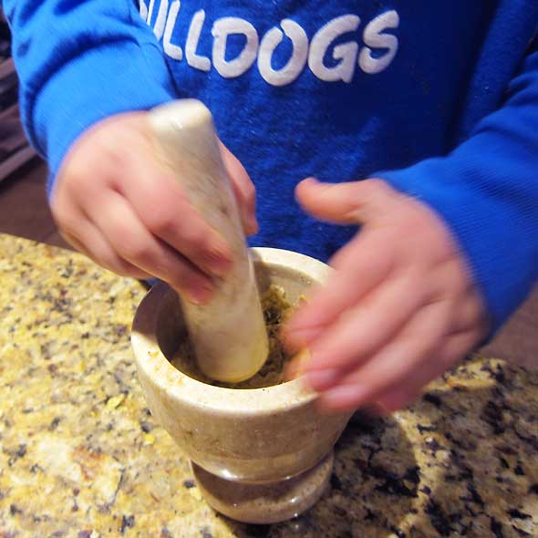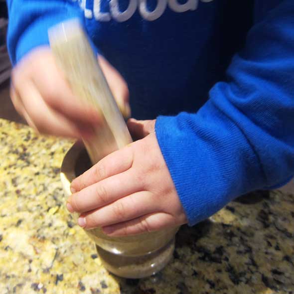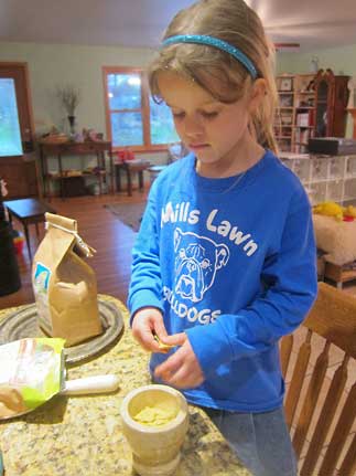My daughter readily took charge of the pestle and mortar breaking pieces of corn chip into the mortar with deliberation. “One for me, three for you.” She has the pounding action down well as she often breaks up almonds for her father. Here she is making crumbs for the top coat of our broiled trout.