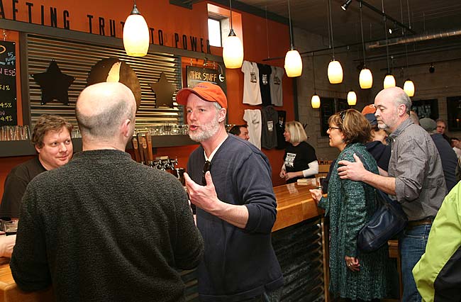 A steady stream of villagers kept the new Yellow Springs Brewery humming all day during its sneak preview brewery tour last Saturday. The brewery, co-owned by Lisa Wolters (shown behind the bar) and Nate Cornett, offered four new beers for tasting, along with facility tours. Lead brewer of the new local business is Jeffrey McElfresh of Kettering, at left behind the bar. The official opening of the new business, which will be open Thursdays through Sundays, is Thursday, April 4.