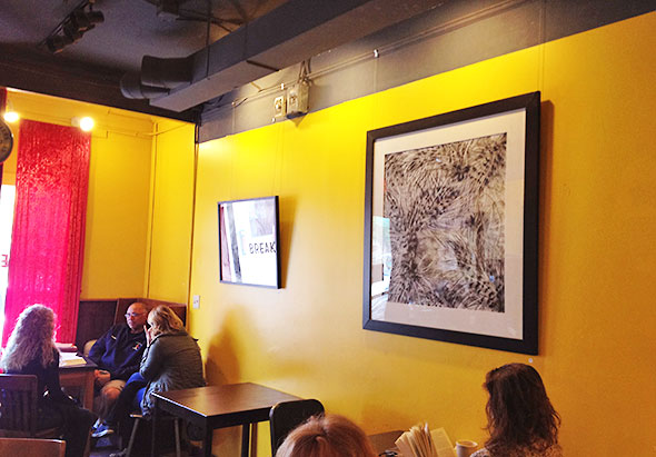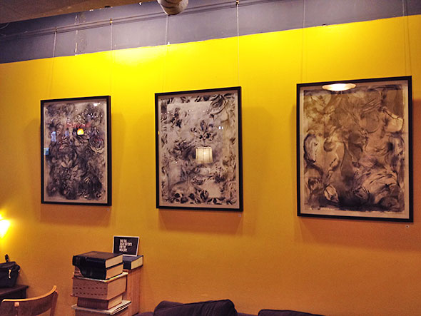 The walls of the Emporium, 233 Xenia Ave, danced as well. The paintings of local artist Jenny Haack grace the Underdog Cafe in an art show that will continue through 1 June 2013. Entitled “Spring Forward, Fall Back”, her series pulses in black and white calling forth many elements of nature.