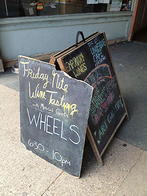 Our friends—the five fine musicians of the band Wheels—were playing Friday night. We saw the announcement first on Facebook, and then Friday morning a chalkboard called out from the Emporium’s main entrance to remind us of that promise we made to ourselves.
