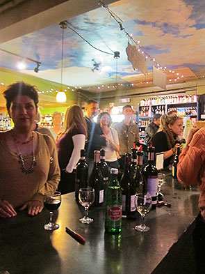 We are big fans of Wheels and, in this town, we were not alone…not nearly. Fortunately, the Emporium had a plan too and a good one. They removed all the tables from the Underdog Cafe so we’d have more standing room. Still we expected a tight fit. Parking was indeed difficult to find downtown, but Kings Yard provided. We chowed on hot dogs and soft shell crab before turning down the street to the music. Not quite everyone made it downtown on that chilly evening, but the crowd was thick and friendly.