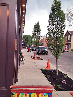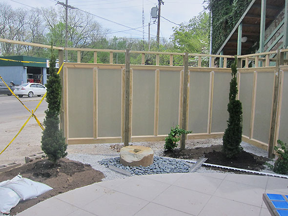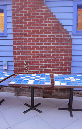 The patio is surrounded by screens suggesting walls rather than fence. The screens are painted a deep eggplant purple to match the front facade of the cafe. An element from the front—the beautiful relief wood carving depicting a cafe table with a plate of fish, mushrooms, brown rice, and kale—now graces the patio winking at visitors as they enter the cafe’s front door. Only the walls of the Wine Cellar’s garden await attention as walls needed to be dismantled in the extensive reconstruction of the front sidewalk. The front sidewalk itself is compete and planted with new trees as slender and tall as teenagers.