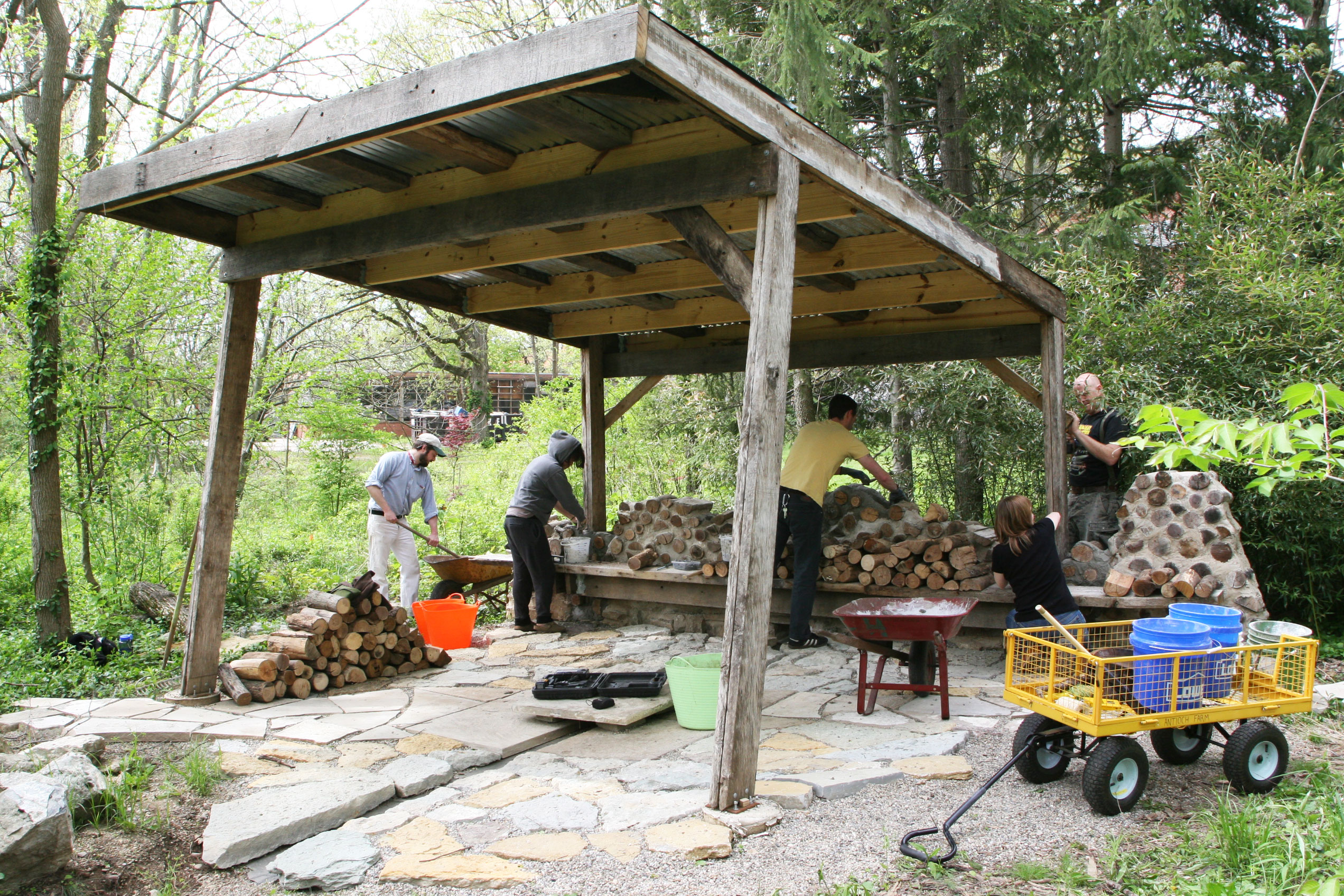 It was a perfect weekend to work on the Tea Pavilion at the Antioch College farm. Some of the volunteers were, from left to right, Charles Viz, a visiting architect from Chicago, Nargees Jumahan, a first year student at Antioch College, (class of 2015), Charles Roderick, a volunteer, Sara Black, Antioch College Visual Arts professor, and Rod Northcutt, Sculpture professor at Miami University. (photos by Suzanne Szempruch)