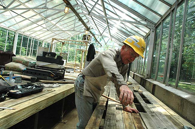 Mac Palmer, ’61, was part of the Antioch Alumni green house crew that spent last week’s alumni work week renovating the glass structure behind the science building. Palmer, 82, and his wife Margery, have attended all but five of the annual work weeks since they began in 1986. (Photo by Lauren Heaton)
