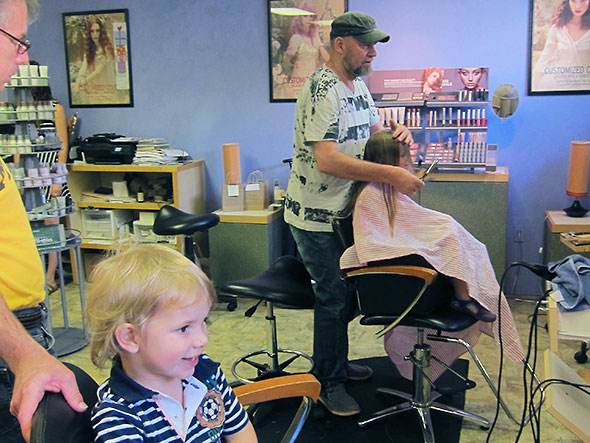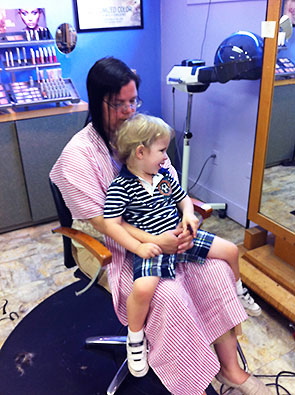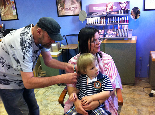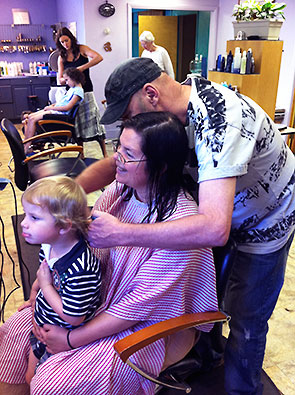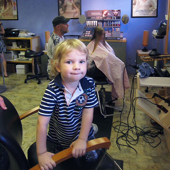 Dad took over entertaining our boy as Crystal washed my hair. Then my son sat on my lap, and we got our haircut together. I must say he liked the idea of getting a haircut better than actually getting one, but he sat without fuss and watched himself transform in the mirror as Gary trimmed his curls into a ducktail.