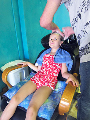 This was the fourth haircut for my six year old daughter, and she and Gary struck up the natural rapport of established friends. Knowing the drill, she popped over to the shampoo and rinse station and settled in for the spa experience. Stacking up a couple of cushions so she could reach the sink, Gary combed through her long locks and gave her a luxurious shampoo and conditioning. Her hair is glorious but a lot of work. We appreciated Gary’s patience as he worked and listened—attentive and engaged. She told of her birthday party, our trip to Aunt Pat’s, and the fact that swimming had been tragically off for a whole week.