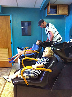 They conferred about how to cut her hair with only minimal input from Mom. That was a good because I was distracted with the boy. My son decided very early on that—oh, yes—he was definitely getting in on this activity. While he waited his turn, he bounced from the shampoo station to a salon chair and, for a time, commandeered Gary’s stool for a few spins. He took me by the hand and insisted that I give it a whirl too and even pulled me around himself once I stationed myself.