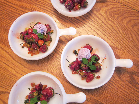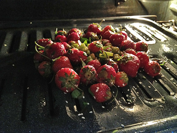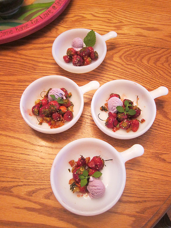 All these I chopped and tossed with the whole, unhulled strawberries adding a generous tablespoon of walnut oil, a pinch of salt, a splash of port, and a dusting of sesame seeds. These I roasted in a 400 degree oven for a good 15 minutes—more than a few minutes—but enough for a light blackening on the flesh of berry and stems. I spooned the roasted fruit into bowls and splashed a little more port on the grilling pan to release caramelized juices into a light syrup. To sweeten the pot, into each bowl I dolloped a melon ball scoop of ice cream, Jeni’s splendid Wildberry Lavender. The ice cream cooled the tongue so that each taste of strawberry rhubarb would shine. The result was indeed wonderfully intense and satisfying and all a fitting end to those last perfect strawberries and the last great gifts of spring.