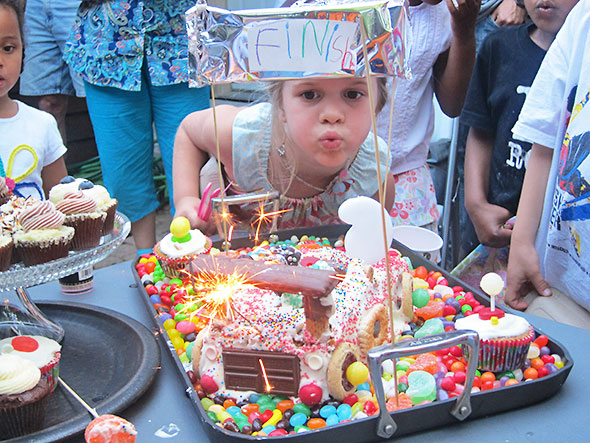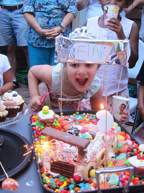 As the cupcakes and children gathered around the cake car, we lit it up with a candle and a sparkler; and my daughter positioned herself at the end of the track for the big finish.