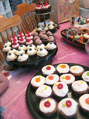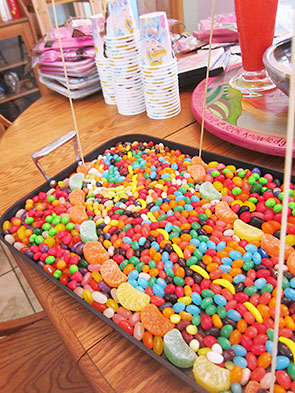 Simple was a good and necessary thing because dessert was resplendent. Our daughter requested a princess party to “drive the boys crazy”. Stalled for inspiration, I had yet to settle on her cake when, the day before the party, we got a prescient notice from the library. Our request was in! We checked out Wreck-It Ralph, a wonderful Disney film based on video arcade games. As we watched the main characters bake and decorate a candy coated car for the speed racer game Sugar Rush, my daughter and I knew what must be done.