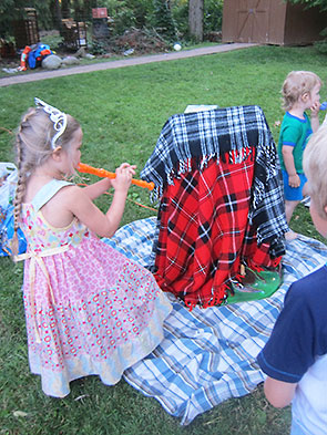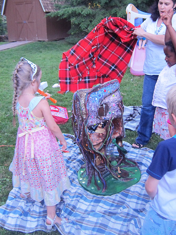 In time honored tradition, after cake, presents were opened. I love how my daughter lingers over the presents prepared at any moment to take off and play with a new treasure even as her friends take her in hand to open the next gift. The family present was a special creation…a faerie house by village artist Sharri Phillips. I’ve loved Sharri’s pieces ever since her exhibit Faerie Real Estate at the Emporium in 2011.
