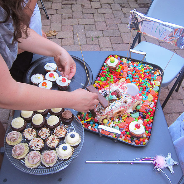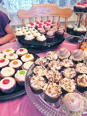 The charming Princess Venellope Von Schweetz needed a host of adoring fans to cheer as she crossed the finish line. For a crowd of cupcakes, I called in the cavalry. The elegant Three Leee Cupcakery furnished 5 dozen mini cupcakes in a dazzling array of flavors—chocolate, lemon, vanilla—all gluten free, heavenly moist, and delicious. My favorite was the lemon topped with toasted coconut, but that may because the raspberry topped chocolate vanished before I had my chance.