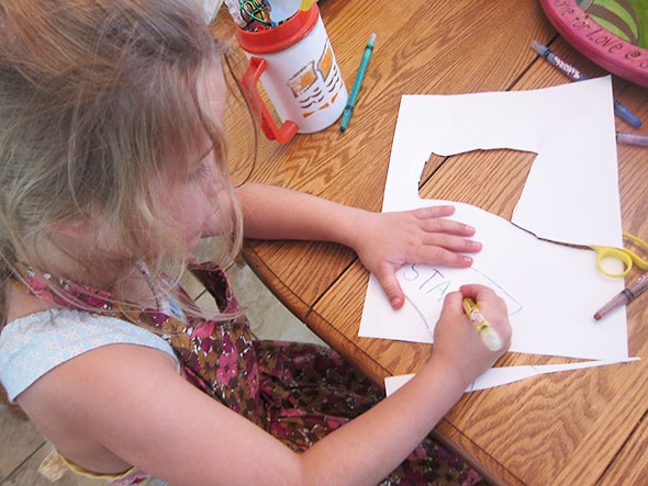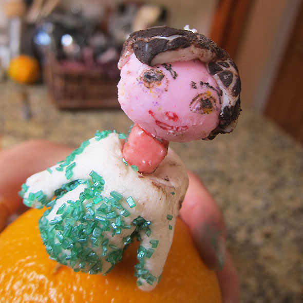 Ok, candy…I dumped our trove of uneaten easter candy and took stock. Among the hard candy and chocolate bars were two pink malt balls nested among chocolate mint patties. I crowed. I drew a face on one pink malt ball using food-safe markers and added the broken up patties for hair. I figured out how to make her neck using a pink Starburst and, then, her hooded sweatshirt from a marshmallow and green sugar leftover from Christmas cookie decorating.