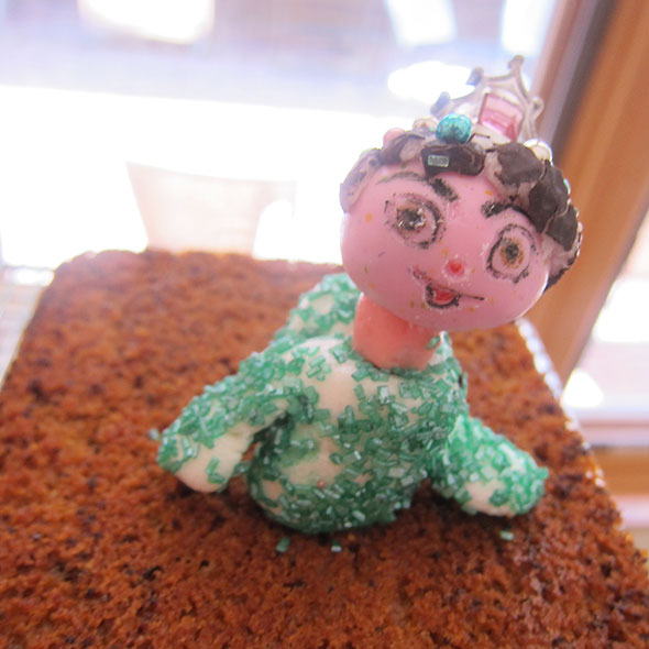 As I worked, though, Venellope began to melt in my hands. I looked at her sweet face and sighed. Time to start over. Using my second and last pink malt ball—again, no pressure—I drew on the face while holding the ball in foil and attached the neck to the head with a toothpick speared through the starburst chew. Setting the head aside, I constructed the torso using a single marshmallow. I cut the marshmallow three times: angled up the back for the hood and, then, two snips on either side of the main body for the arms. To make Venellope’s hoodie a pixelated green, I rolled the cut marshmallow—lightly dampened—in a bowl of green sugar. I speared the head and neck onto the body with the toothpick and speared the figure three more times to seat Venellope on the cake loaf with her arms raised. Finally I added her hair working quickly to keep the chocolate from smudging and crowned her head with a jeweled ring—a prized token of my daughter’s.