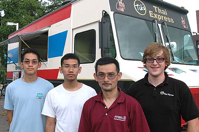 Tik Sripol sends the men in her family out on the road to vend the spring rolls and curry from her Tik’s Thai Express restaurants in the region. Her husband, Gita, center, his sons Peter, left, and Steven, far left, and their friend Sam Foskuhl have recently brought the food truck to the village and plan to return here most weekends throughout the summer. (Photo by Lauren Heaton)
