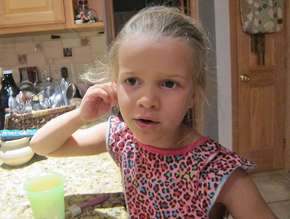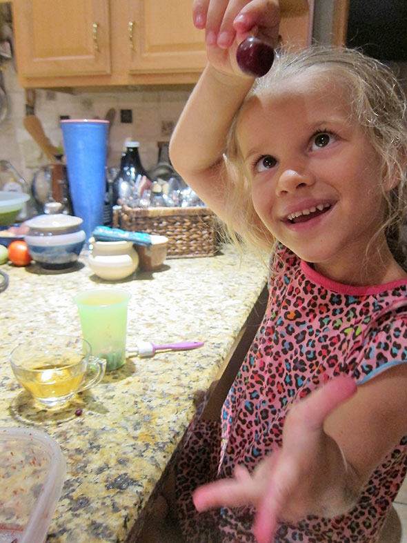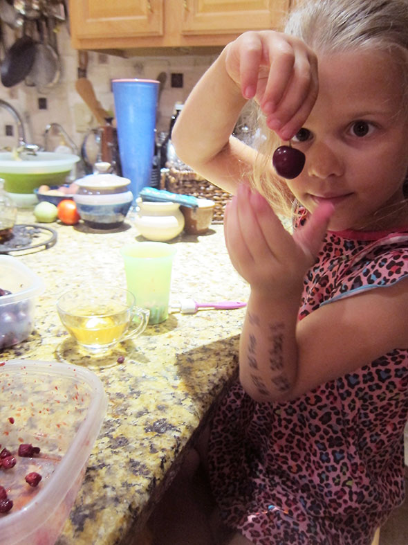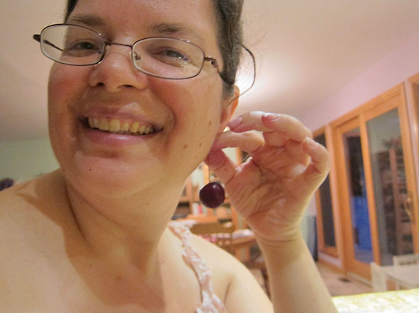 We moved through the pint of cherries in a cheery mood. I removed the stems occasionally imagining mine as earring. She imagined herself as an announcer confidently publicizing to stay tuned, EVERYBODY, for exciting CHERRY POPSICLES! At the last, she was a magician making cherries disappear. “Where’d they go?”