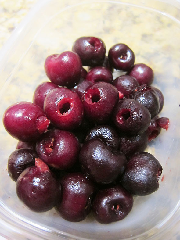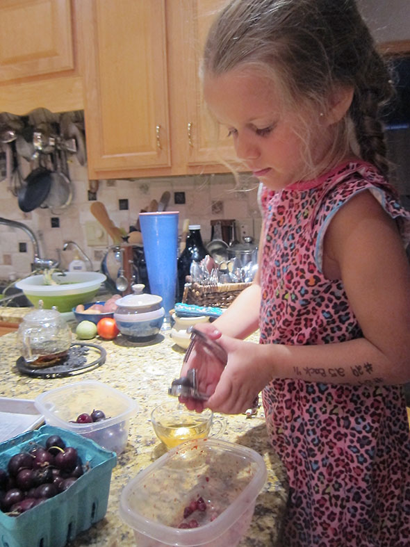 Pitting cherries is a messy task. It might even be tedious but for excellent companionship. As it was, we had a good time releasing the hard seed from the firm, juicy, burgundy fruit. In the division of labor, my daughter took command of the cherry pitter, fitting really since it belongs to her. We bought the pitter for her when she was one years old. We carried it in her diaper bag for dinners at the Winds Cafe in case she plowed into their complimentary olive plate which was often enough and until she could be trusted to not swallow the pits.