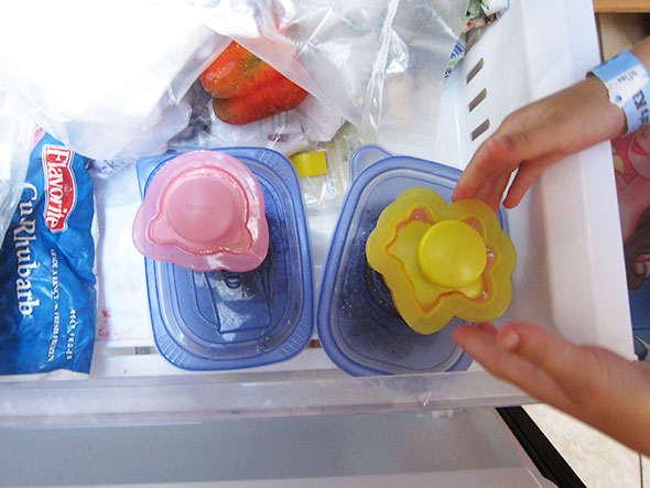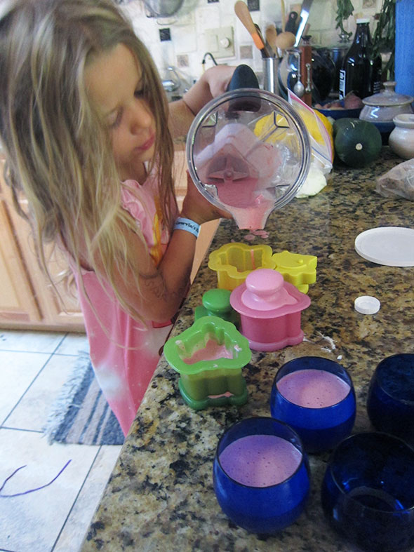 In the days between prepping the cherries and making the smoothies, my daughter had not forgotten what she was about. She got out our popsicle molds—in the shapes of a cow, a chicken, and a pig—and loaded them half full with about half the smoothie mixture. Next we popped them into the freezer to chill over night.
