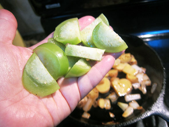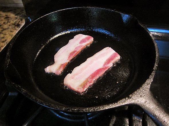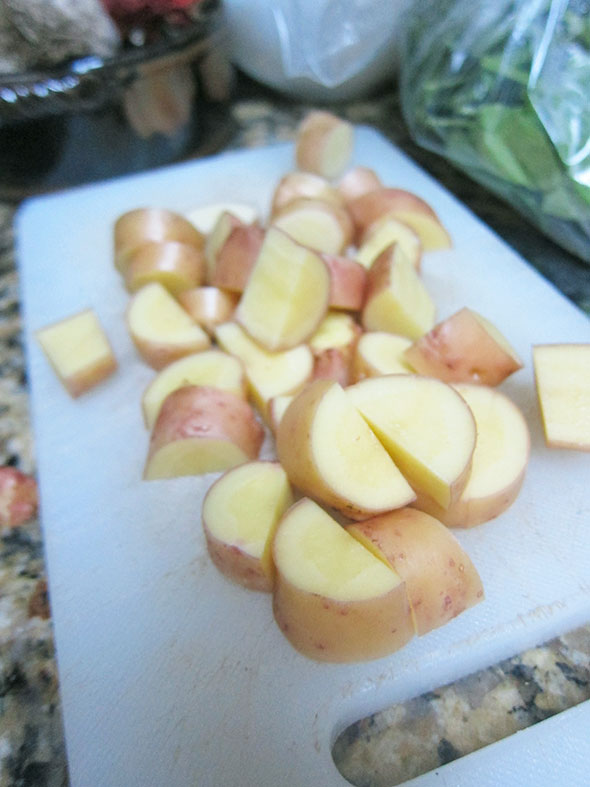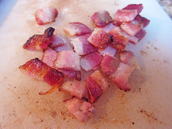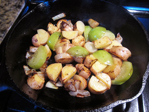 Another thing I reached for was a slice of my favorite bacon, a thick slab from the hind of pigs at Anderson Farms. I had a sudden craving for breakfast potatoes just like my sister Kate makes. I imagined her at her stove throwing the chopped vegetables in the air and set to work.