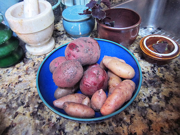 I harvested potatoes from two of my gardens this week. The more fertile garden on the southern slope produced mature red-skinned tubers. The soil here was particularly rich from the buried wood, compost, and worm castings I added. A side garden yielded flesh-toned fingerlings. The fingerlings were less mature telling me that soil in this side garden needs attention and I suspect better irrigation, but I can’t really complain. I rather like the thinner skinned new potatoes, and once in my kitchen they were the first ones I reached for.